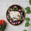 This beautiful pichwai painting features the Hindu deity Krishna cradling his beloved calf, surrounded by a vibrant array of flowers.